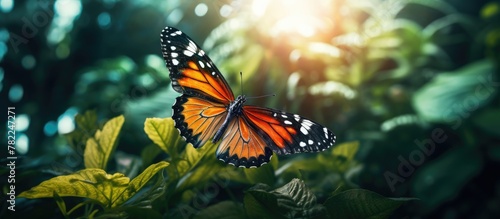Obraz premium Butterfly perched on green leaf under sunlight