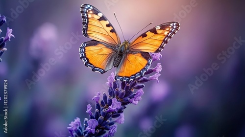 © melvilsky, Obraz premium Butterfly perched on lavender blooms in a tranquil garden during golden hour light