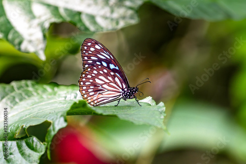 Fototapeta premium Butterfly perches on vibrant green tree leaves