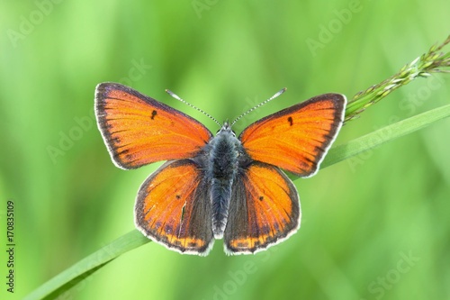 © Monikasurzin, Obraz premium Butterfly Purple-edged copper (Lycaena hippothoe). Red butterfly with green background.