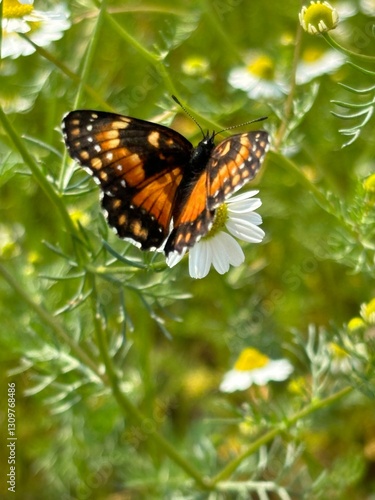 Obraz premium Butterfly resting in a chamomile field