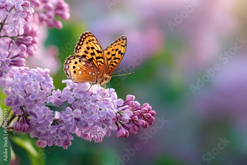 © Alina, Obraz premium Butterfly resting on blossoming lilac flowers in a tranquil garden setting