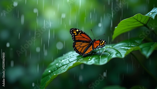 Fototapeta premium Butterfly Resting on Leaf in Rain