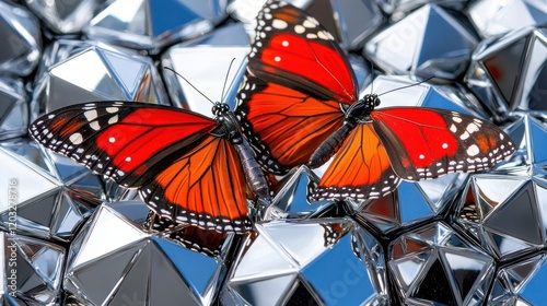 Fototapeta premium Butterfly resting on shiny geometric shapes, vibrant orange and black colors.