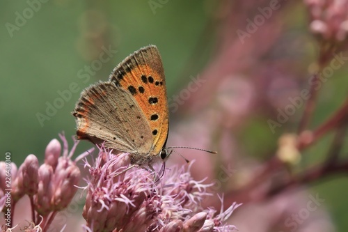 © Monikasurzin, Fototapeta premium Butterfly small copper sitting on the flower. American copper with green background, Common copper. Lycaena phlaeas