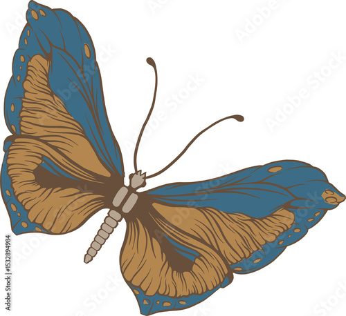 Naklejka premium Butterfly spreading blue and gold orange wings with veins in flat style, transparent background