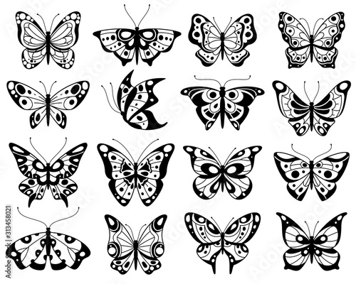 © YummyBuum, Obraz premium Butterfly. Stylized exotic butterflies silhouettes with openwork wings, summer flying insects. Romantic wedding card isolated vector elements