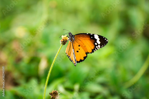 © suman, Fototapeta premium Butterfly sucking homey from flower with green blurred background