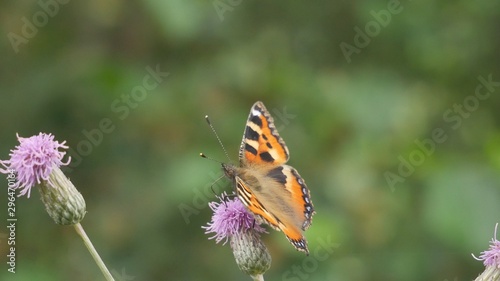 © Rbizon, Fototapeta premium Butterfly urticaria on a flower of Cirsium field eats nectar.