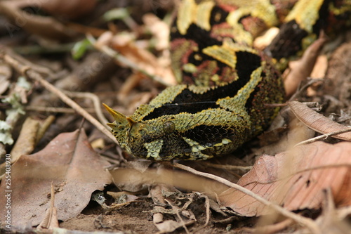 Naklejka premium Butterfly viper, also called rhinoceros viper, river jack or arrowhead viper in its natural habitat. An extremly venomous animal occurring in African rain forests.