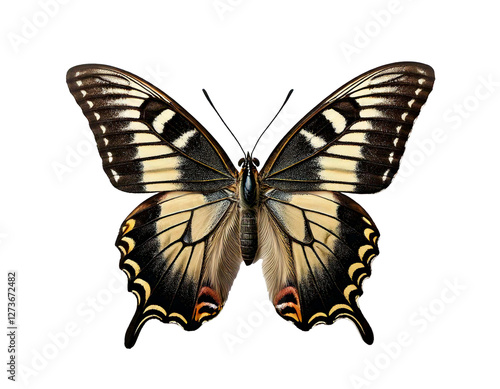 Fototapeta premium Butterfly, white background, HD, high-quality, realistic photo, delicate wings, intricate patterns, vibrant colors, symmetrical shape, natural beauty, clean composition, professional lighting, sharp f