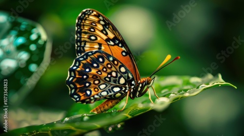 Fototapeta premium Butterfly with spotted wings rests delicately on a leaf