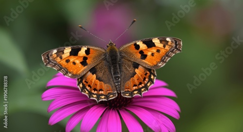 © CreativeBro, Obraz premium Butterfly with tortoise shell wings sitting atop bright pink flower