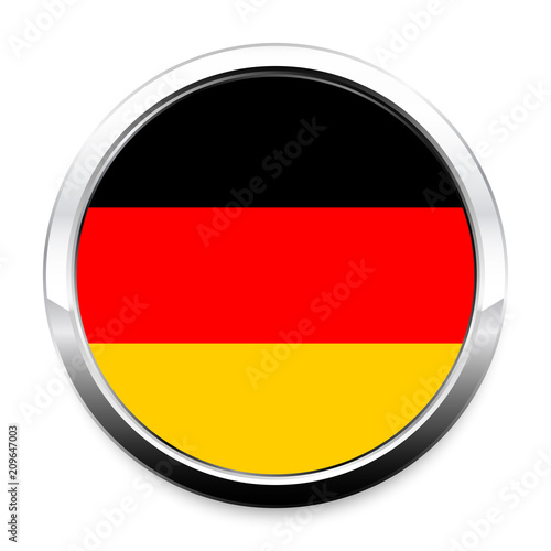 © Itana, Naklejka premium Button Flag of Germany in a round metal chrome frame with a shadow. The symbol of Independence Day, a souvenir, a button for switching the language on the site, an icon.