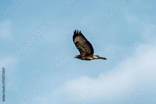 Obraz premium Buzzard bird soaring with wings spread against a light blue sky with wispy clouds, representing freedom and nature