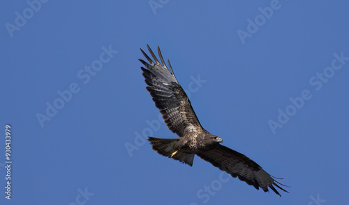 Obraz premium Buzzard in flight, flying buzzard with blue sky, buzzard with outstretched wings
