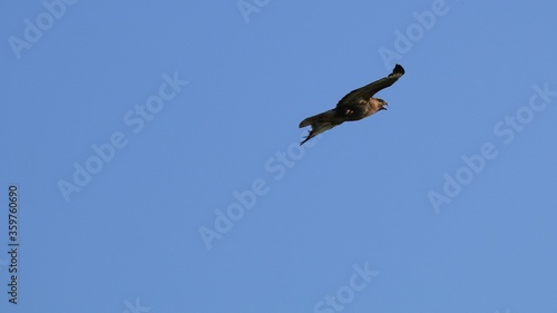 Obraz premium Buzzard side view flying against a light blue sky