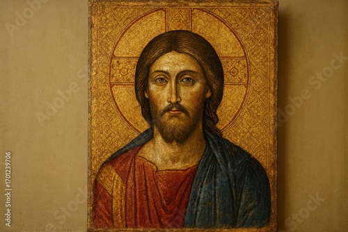 © Bijac, Naklejka premium Byzantine style gold leaf icon of Christ Pantocrator with serene halo intricate patterns aged pigment cracks sacred devotional art photographed with soft light