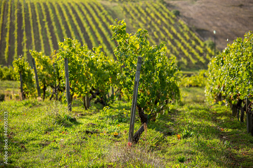 Naklejka premium Cèpes de vigne alignés dans un vignoble au soleil avant les vendanges.