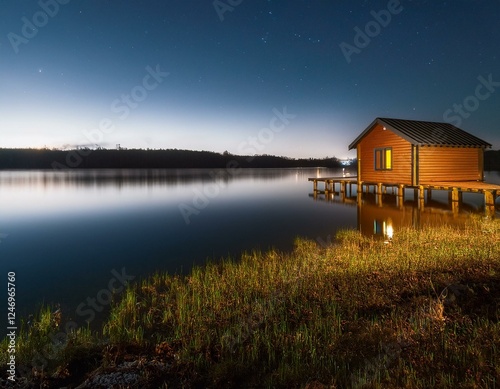 © Argiduna, Fototapeta premium Cabaña de madera y piedra a orillas del lago en un pintoresco. paisaje rural con flores de hierba verde, hermoso lugar natural