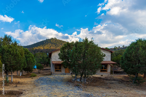 © Andres , Obraz premium Cabaña de piedra tras árbol en bosque con montaña al fondo cielo azul y nubes