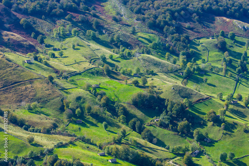 Fototapeta premium Cabañas Pasiegas and meadows, Miera Valley, Valles Pasiegos, Cantabria,...