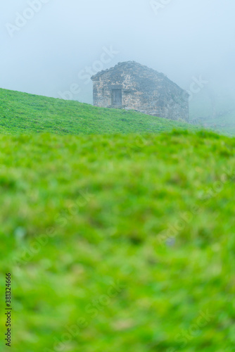 © JUAN CARLOS MUNOZ, Fototapeta premium Cabañas Pasiegas and meadows, Miera Valley, Valles Pasiegos, Cantabria, Spain, Europe