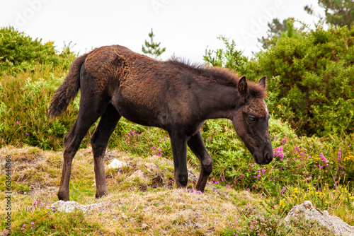 © Ana, Fototapeta premium Caballo pardo salvaje pastando libre en una pradera verde de los montes de Galicia, España.