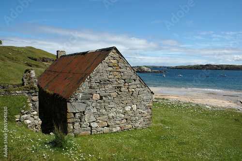 Obraz premium cabane de pêcheurs en pierre; mer; Talmine; Ecosse; Grande Bretagne