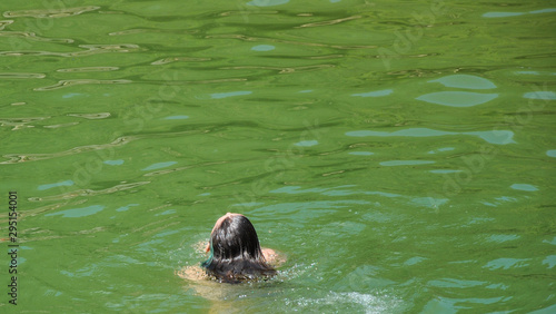 Obraz premium Cabeza de mujer por detrás con pelo mojado dentro del río