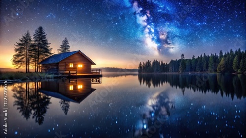 Fototapeta premium Cabin by calm lake with starry night sky reflected on water, evening scene,...