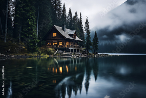 © Canvas Alchemy, Fototapeta premium Cabin by lake amidst trees