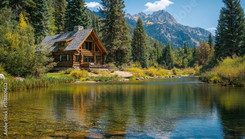 © Wa Bale, Fototapeta premium Cabin by lake, surrounded by forest, mountains in the background, sunny day