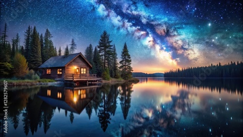 Fototapeta premium Cabin by serene lake with starry night sky reflected in calm waters, calm water