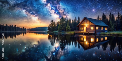 Fototapeta premium Cabin by serene lake with starry night sky reflection, peaceful lake