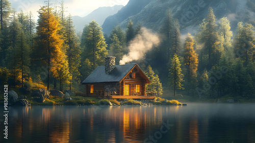 © Firly, Fototapeta premium Cabin by the Lake, 3D Illustration