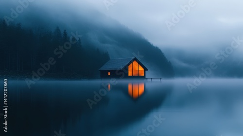 © Ishika, Fototapeta premium Cabin glows in misty water