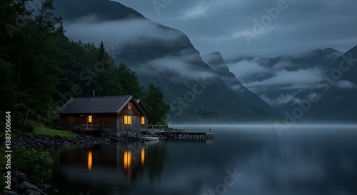 © Morits Art, Fototapeta premium Cabin Glows on Lake with Misty Mountains and Reflections at Dusk