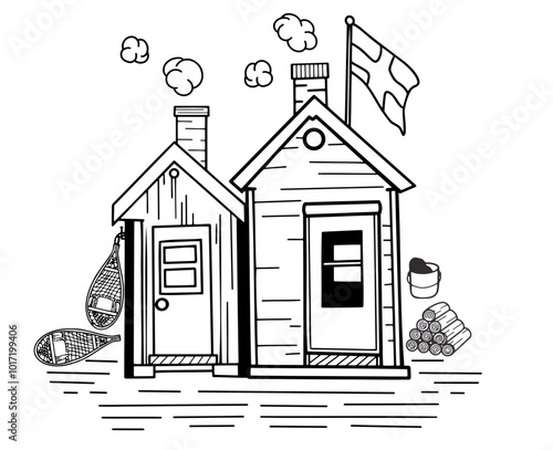 Fototapeta premium Cabin house/ station house with flag, firewood, and snow shoe