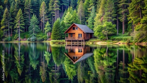 © Anulak, Fototapeta premium Cabin in the woods with lake background