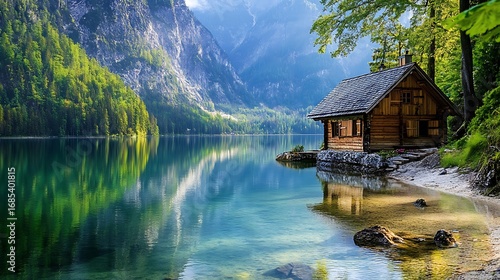 © Maham, Fototapeta premium Cabin lake mountain landscape scenic nature travel destination tourism adventure vacation retreat getaway 100