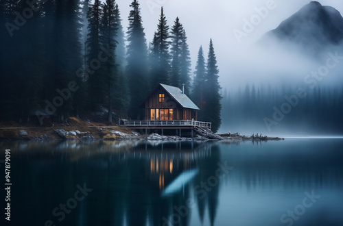 © Canvas Alchemy, Fototapeta premium Cabin on the shore of a lake surrounded by trees