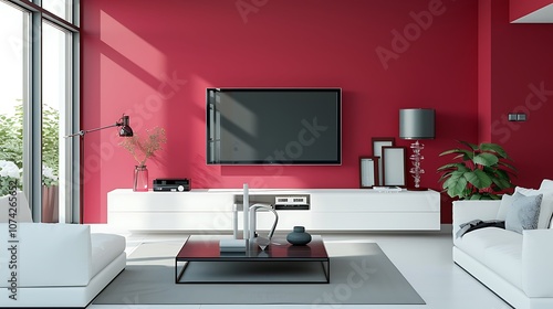 © Ultra promax , Fototapeta premium Cabinet for TV in a modern living room set against a white viva magenta wall background, showcasing contemporary design