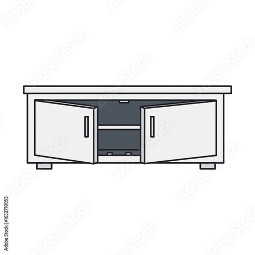 © Murda, Fototapeta premium Cabinet with two open doors revealing interior shelves and small legs.