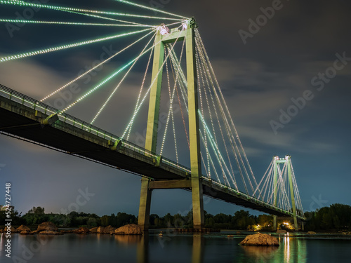 Naklejka premium Cable-stayed bridge across the river at night. Night illumination of...