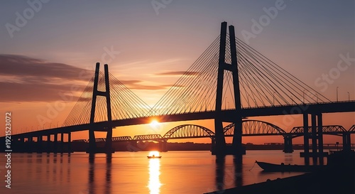 © Kopi, Obraz premium Cable-stayed bridge at sunset waterfront.