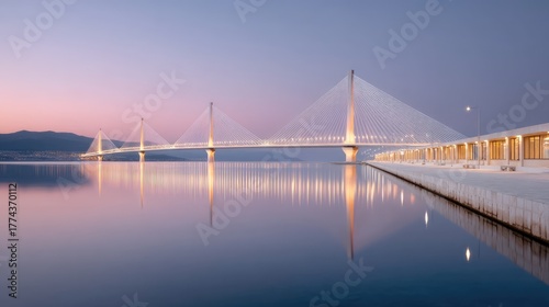 Fototapeta premium Cable Stayed Bridge Illuminated At Twilight Over Calm Water With Reflection...