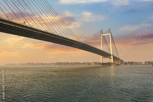 Obraz premium Cable stayed bridge known as Vidyasagar Setu on river Ganges at sunset at...