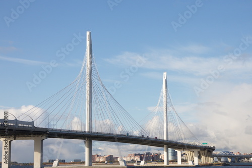 © Andrey, Obraz premium Cable-stayed bridge over a large river on a sunny day
