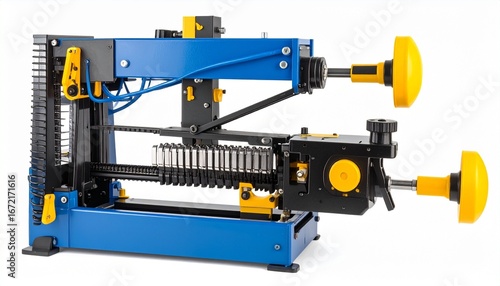 © Rasheeda, Fototapeta premium Cable stripping machine with adjustable blades rotating handle and heavy duty frame isolated on white background industrial electrician cable preparation device